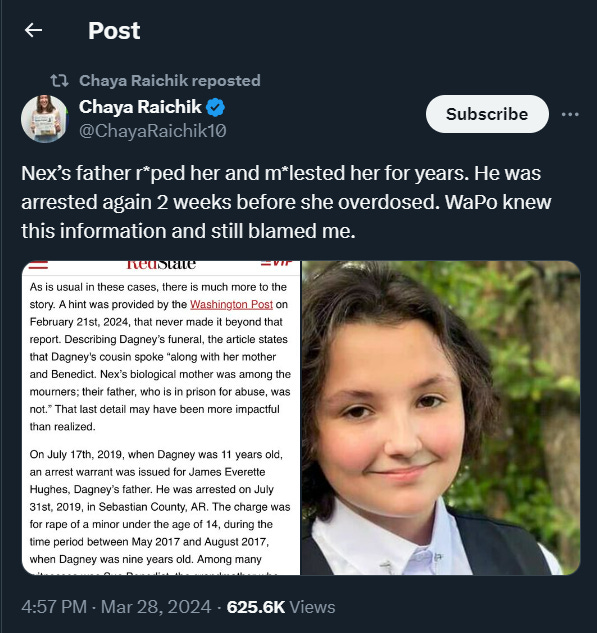 As for the Washington Post’s reportage on Dagney’s suicide, in what can only be described as journalistic malpractice: instead of telling the truth, WaPo has decided that the final blame rests with Chaya Raichik and Libs of TikTok.