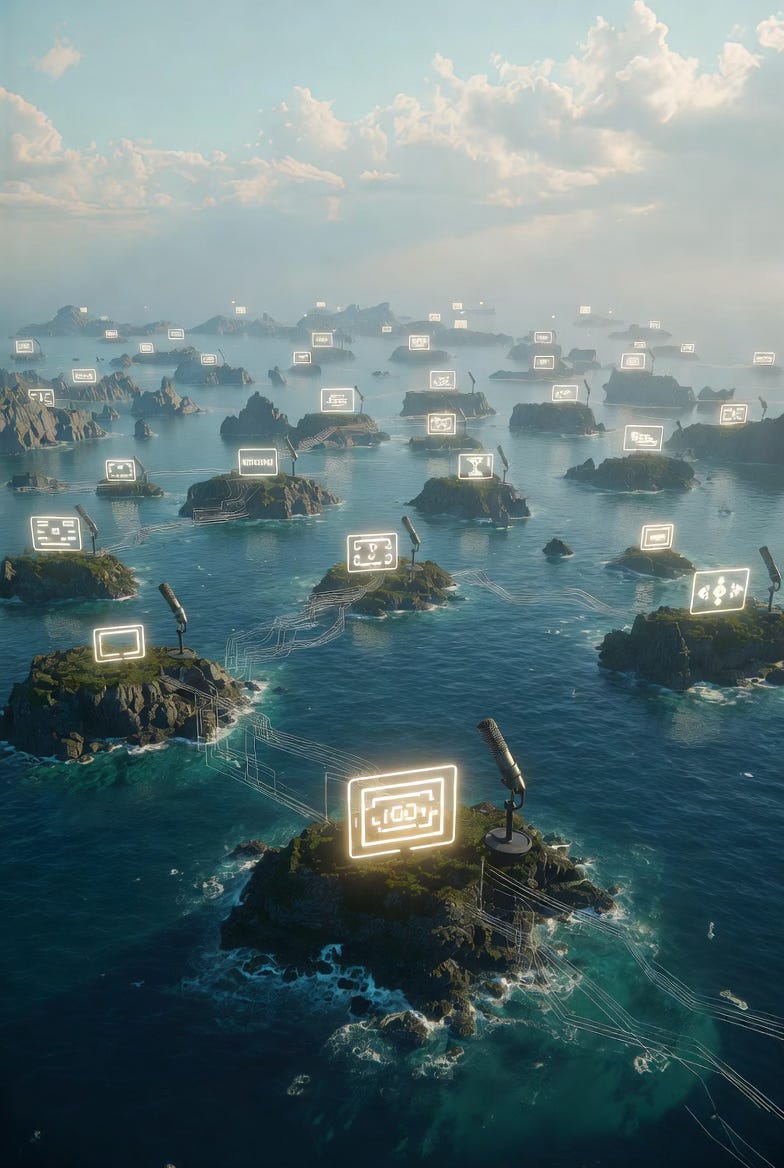 The interfaces are beautiful, seamless, addictive. The connection feels total. Yet we’ve willingly moved onto a chain of islands floating in a corporate ocean, free to decorate our little plots, free to shout into the wind, but never truly free to leave or to speak without consequence.